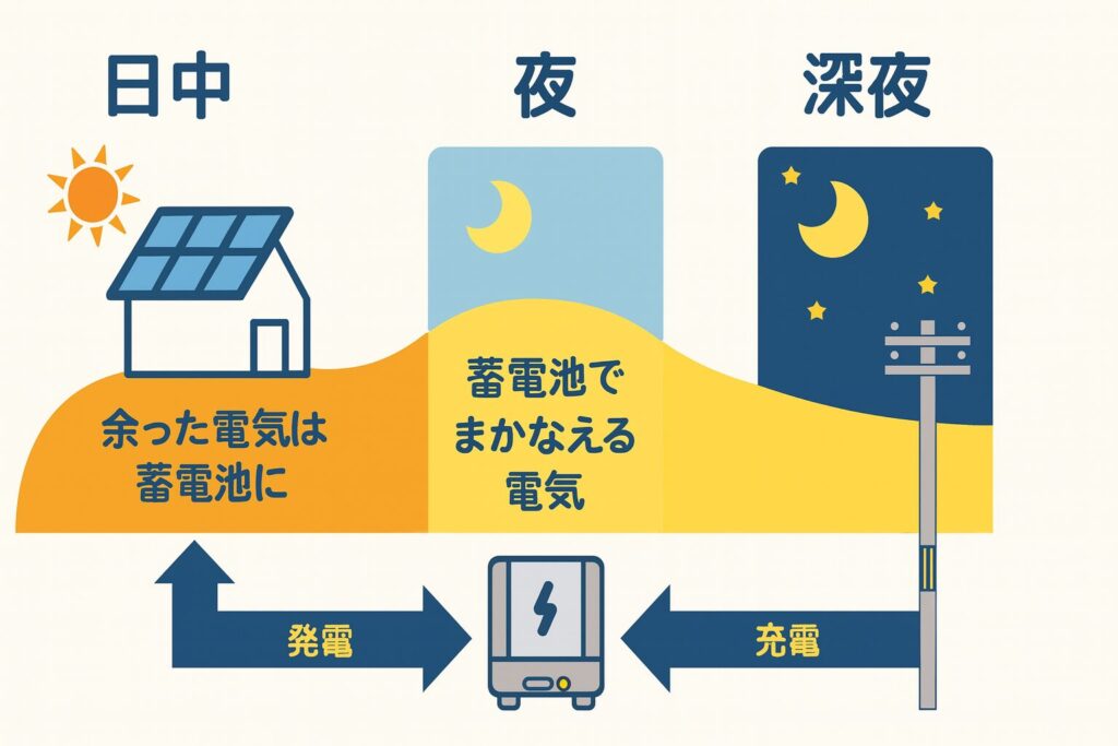 日中に太陽光パネルで発電 → 使いきれなかった分を蓄電池に貯める → 夜に蓄電池から電気を使う