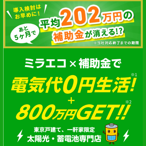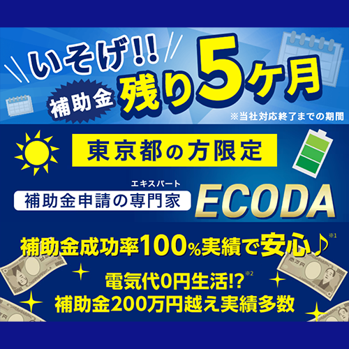 ![]() ECODA 業界トップクラスの低金利! | ![]() ミラエコ 工事実績3,000件以上 | ![]() 節電プロ 電気代最大80%削減 |