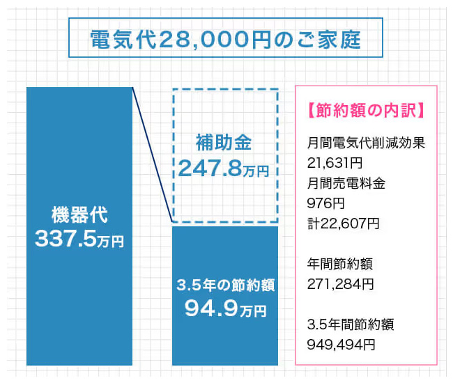 「ECODA」の「家庭用蓄電池+太陽光パネル」を導入すれば、約95万円の節約が可能になります。
