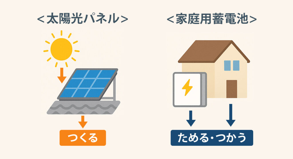 太陽光パネルと蓄電池は、どちらも家庭の電力に関係しますが、役割がまったく異なります。両者を組み合わせることで、自家発電と自家消費の効率を最大化できます。